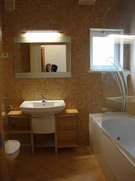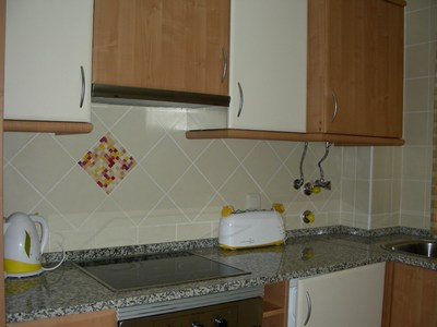 The apartment is nicely furnished and comprises of entrance hall, shower room, twin bedroom with patio door opening onto the terrace; double bedroom with ensuite bathroom (bidet and hydro massage bath also with shower, built-in wardrobe and French window opening onto a balcony; the fully equipped kitchen, with hob, oven, fridge / freezer, kettle, toaster and washing machine and dishwasher; the lounge / dining room which seats 8 people has a sofa bed,TV, DVD and a patio doors that open onto the easternly facing terrace. The complex has landscaped garden, a large communal swimming pool with a waterfall and a Jacuzzi and a children’s paddling pool.