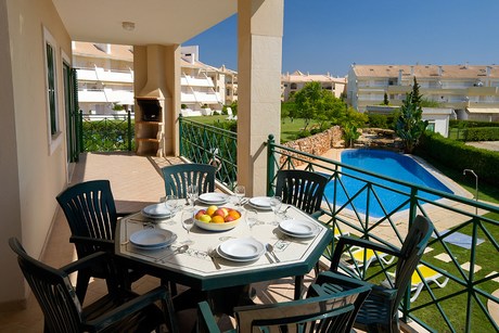 The Portofino Apartaments are a new complex built to a high standard and with luxury furnishings. The complex has an excellent location in a residential area to the west of the Marina,. It is situated at approximately 900 metres from the Marina, a 10-minute gentle walk and 1.200 metres from the Falésia beach also a 10-minute leisurely walk. The apartment is located on the first floor of a new condominium, it overlooks the large communal swimming pool and garden. The apartment is decorated to a very high standard, is very well equipped and comprises of the entrance hall, shower room, lounge /dining room with seating for six people, satellite and cable TV, DVD which also plays CD’s, sofa bed and patio doors opening onto the large terrace with BBQ and patio furniture ideal for Al-fresco meals. the kitchen is well equipped with hob, oven fridge/freezer, dishwasher, washing machine with dryer, toaster, kettle, microwave, etc.; a twin bedroom with patio doors that open onto the terrace and the master bedroom with double bed and en suite bathroom which has an hydro massage bath and patio doors opening onto the terrace . There is underground parking. The communal swimming pool and the children’s pool are salted water. There is also a Jacuzzi.