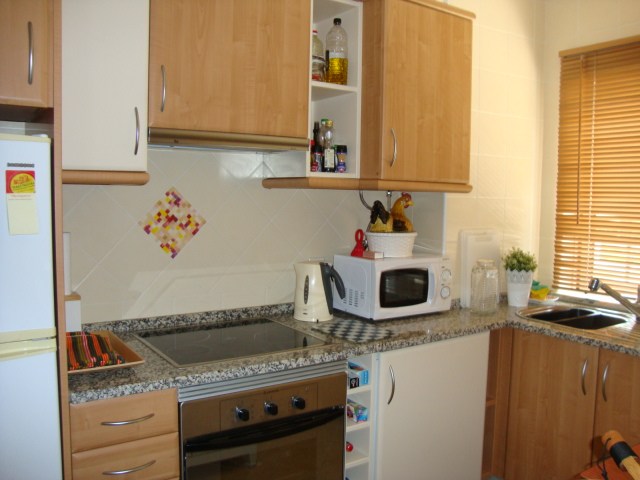 The one bedroom apartment is beautifully furnished and comprises of entrance hall, full bathroom with bidet and hydro massage bath also with shower, a double bedroom, it has a built-in wardrobe and French window opening onto a balcony; the fully equipped kitchen, with hob, oven, fridge / freezer, kettle, toaster and washing machine and dishwasher; the lounge / dining room which seats 4 people has sofa bed, cable TV and a French window that opens onto the south facing terrace. The apartments are air conditioning. The complex has landscaped garden, a large communal swimming pool with a waterfall and a Jacuzzi and a children’s paddling pool.